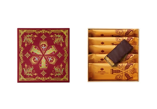 商品特長:サクサクのウエハースにキャラメリゼしたアーモンドの香ばしさ、ほのかに香るシナモン、クローブスがアクセントに。クーベルチュールチョコレートの力強いカカオの風味とアーモンドの食感が口の中で広がります。
