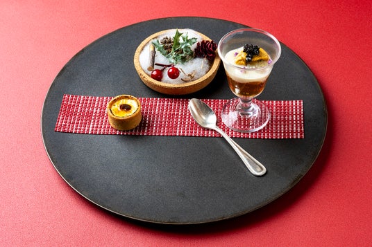 暖かな灯りと落ち着いたインテリアに包まれた店内は、特別な夜をゆったりと過ごすのにふさわしい上質な空間。シェフが厳選した旬の食材を使い、クリスマスの趣を添えた華やかな盛り付けでお届けする全9品のフルコースは、記憶に残るひと皿ひと皿です。