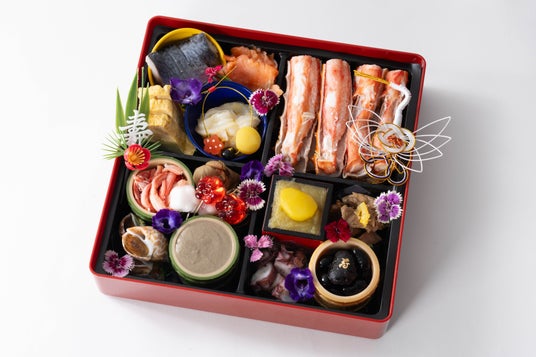 たらば蟹、紅ずわい蟹、かにみそ、栗きんとん、酢たこ、まぐろしぐれ煮、黒豆、寿そら豆、ばい貝、赤にし貝、スモークサーモン、玉子焼、黄金いか、自家製〆さば