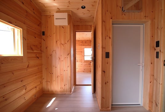 ●標準仕様:北欧産ログ材、ガルバリウム鋼板縦片流れ緩勾配屋根、樹脂製高断熱ペアガラス、フローリング、IHシステムキッチン、3点ユニット(バス、洗面台、水洗トイレ(温水洗浄・暖房便座))、室内照明器具、床暖房、サウナ