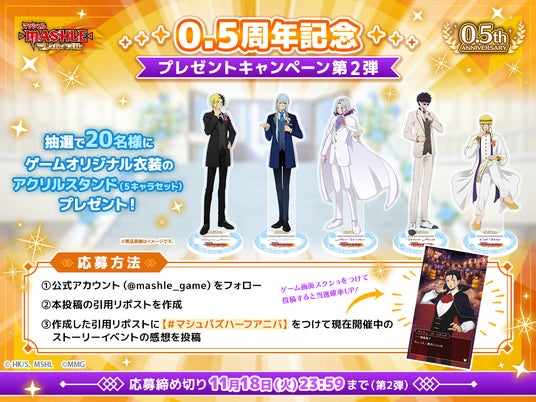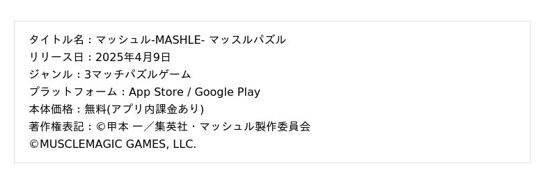 ポッピンゲームズジャパン株式会社(本社:東京都港区、代表取締役 CEO:谷口祐一郎)と合同会社MuscleMagic Gamesが開発・運営するアニメ『マッシュル-MASHLE-』初のスマートフォン向けゲームアプリ『マッシュル-MASHLE-マッスルパズル』(略称:マシュパズ)は2025年11月5日(水)より『0.5周年記念イベント』を開催いたしました。0.5周年を記念しての豪華な限定イベントやキャンペーンを実施しております。