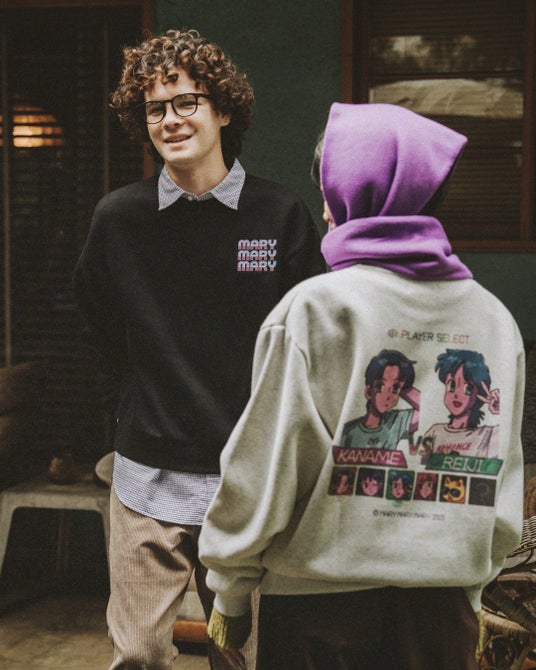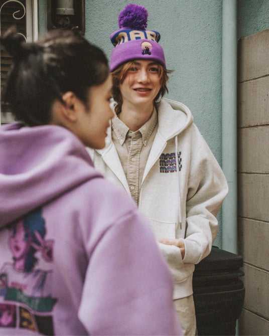 代名詞となる”エモい”イラストがプリントされたスウェットやニットなど、秋冬に活躍するウェアをはじめ、ニット帽やマフラーなどのアパレル小物を計6型展開する。