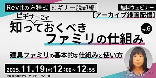 株式会社クリーク・アンド・リバー社(C&R社)は11月19日(水)と26日(水)の2回にわたり、Revitの使用経験が浅いBIMオペレーターや設計者の方を対象に、2024年6月・8月に開催したオンラインセミナー「【Revitの方程式・ビギナー脱却編】ビギナーこそ知っておくべきファミリの仕組みVol.6/Vol.7」のアーカイブ映像を無料配信します。