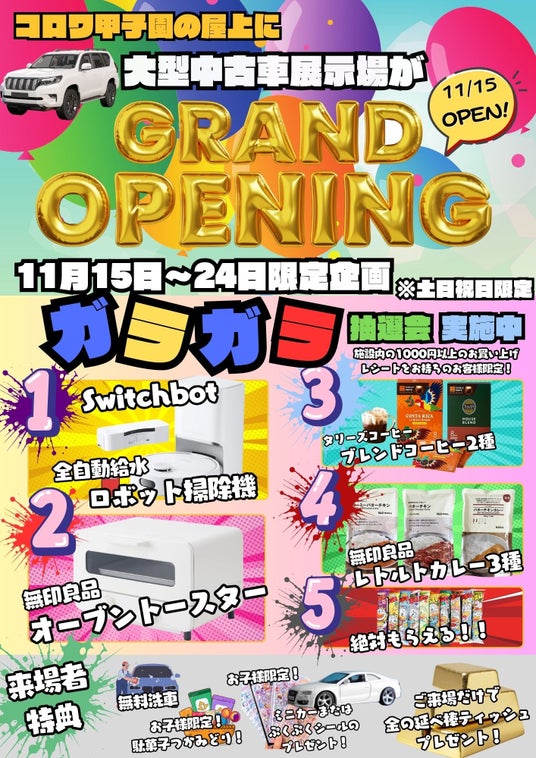 コロワ甲子園屋上駐車場に100台規模の中古車展示場が2025年11月15日グランドオープン