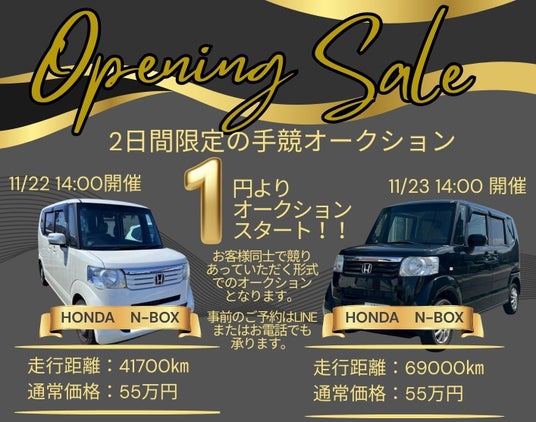 オープンイベントして、厳選中古車をなんと1円からオークションスタートお客様同士で競りあっていただく形式の手競オークションで、22日と23日の2日間、それぞれ1台ずつ出品の2台限定となっております。