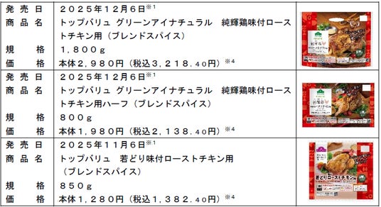 イオンは11月6日より順次※1、「イオン」「イオンスタイル」「マックスバリュ」など全国約2,400店舗※2にて、クリスマスなどのパーティ需要にお応えする本格的なオーブン調理対応商品「トップバリュ グリーンアイオーガニックナチュラル純輝鶏味付ローストチキン用(ブレンドスパイス)」トップバリュ 若どり味付ローストチキン用(ブレンドスパイス)を発売します。