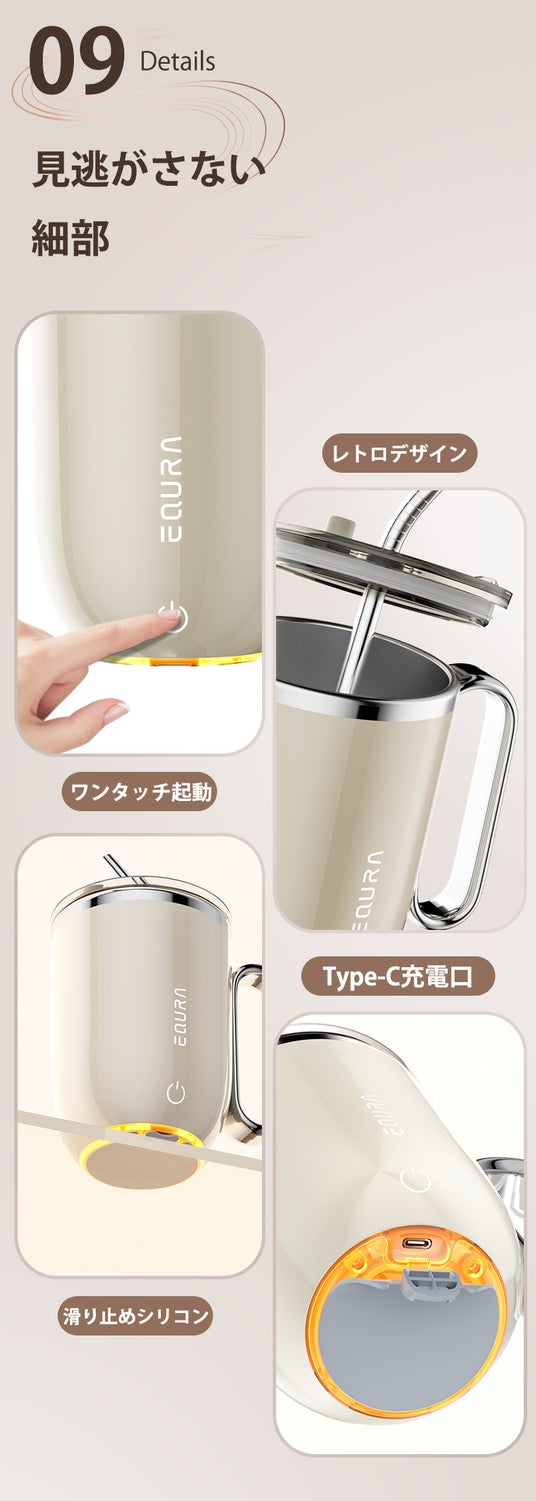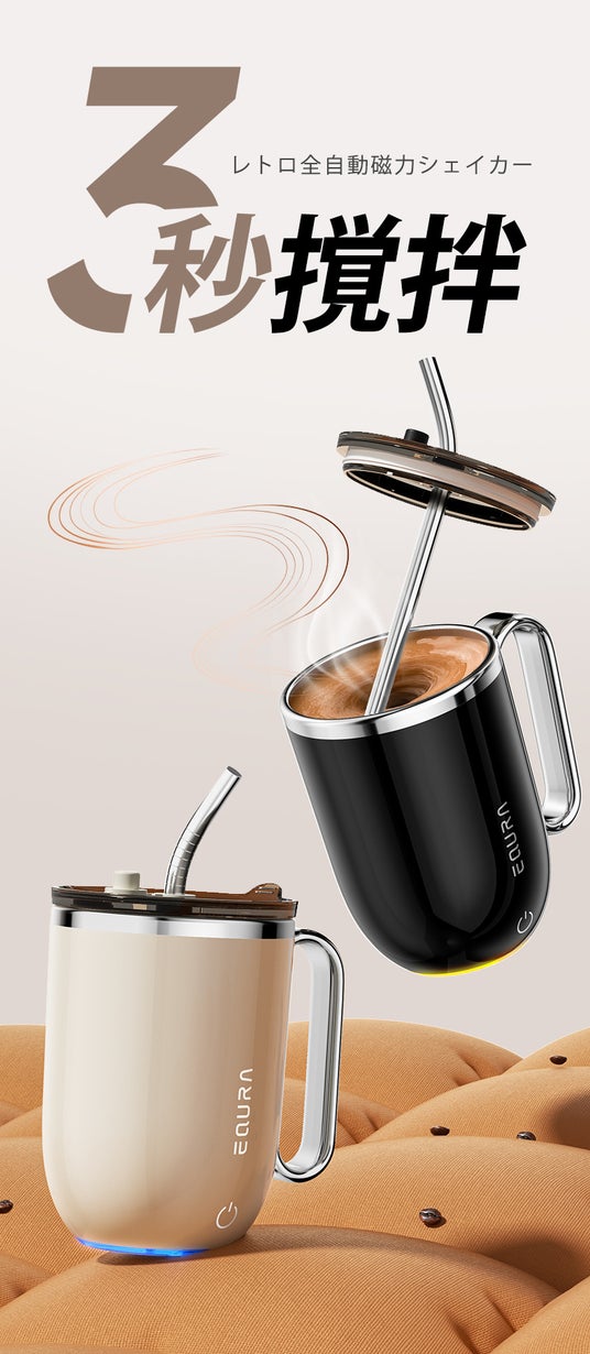 EQURAレトロ磁力シェイカーは、高速モーターと316ステンレス製磁力ローターを組み合わせた独自機構を搭載。毎分7000回転のパワーが生み出す渦が、水と粉末を一気に引き込み、わずか30秒でムラのない均一なドリンクを完成させます。まるでバリスタが手掛けたかのような滑らかな口当たりと、素材が引き立つ味わいを、どこでも手軽に楽しめます。