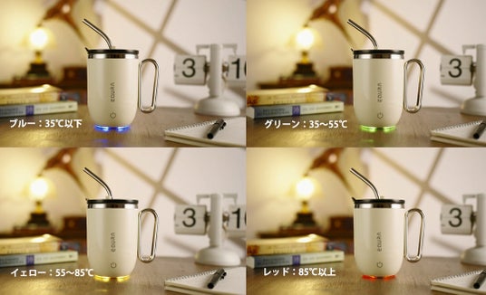 レトロなデザインに加え、温度表示機能を新搭載。飲み物の温度に応じて底部のLEDライトが色を変えます。