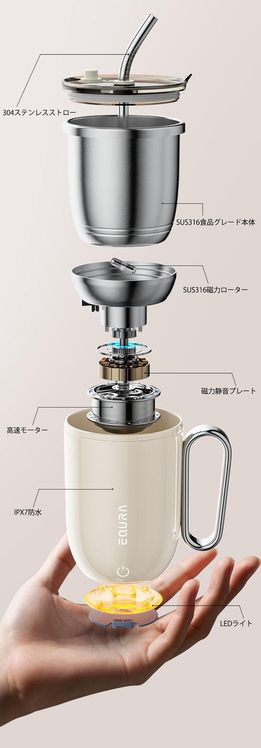 カップの底部に磁力があり、それに連動した316ステンレス製ローターが、7000rmp/minの高速モーターで30秒でに均一なドリンクを素早くかき混ぜます。
