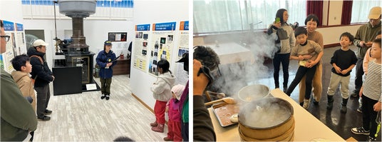 その後、昼食会場のホテルにて石焼料理の実演と試食体験を実施。約800度に加熱された溶結凝灰岩を鍋に投入すると瞬時に水が沸騰し、激しい音を立てながら調理が進む様子に参加者からは「おー」「わー、すごい!」といった歓声が上がり非常に高い関心が寄せられました。味噌を加える最終工程では、会場内に味噌と魚の香りが広がり石焼料理が完成。多くの参加者にとって初めての体験となりましたが、温かい汁と鯛の旨味が好評を博し食事は大変満足度の高いものとなりました。