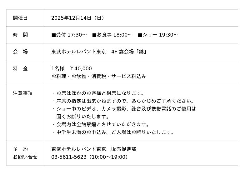 株式会社東武ホテルマネジメント(本社:東京都墨田区、代表取締役社長:三輪 裕章)の東武ホテルレバント東京(所在地:東京都墨田区)では、12月14日(日)に『小林幸子 クリスマスディナーショー』を開催いたします。2024年に芸能生活60周年を迎え、常に新たな挑戦をし続ける小林幸子氏の圧巻のパフォーマンスと、東武ホテルレバント東京が贈るこだわりのコース料理とともに、一夜限りの特別な体験をお届けいたします。