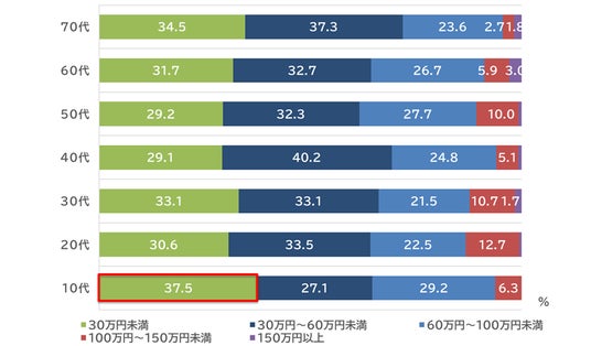 - 一方で、10代では「30万円未満」(37.5%)が最も多く、他の年代でも「30万円未満」が約3割前後を占めている。