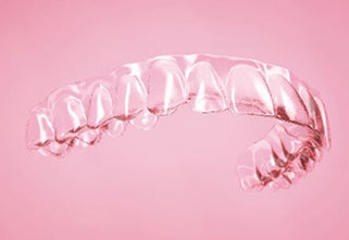 透明のマウスピース状の装置。患者の口腔内石こう模型や口腔内の3Dスキャニングデータを用いて製作する。