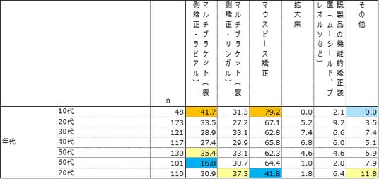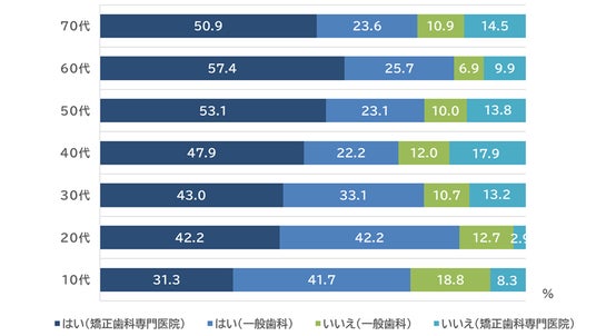 - 10代では「はい(一般歯科)」が41.7%、「はい(矯正歯科専門医院)」が31.3%、20代では両者が42.2%と同率だった。