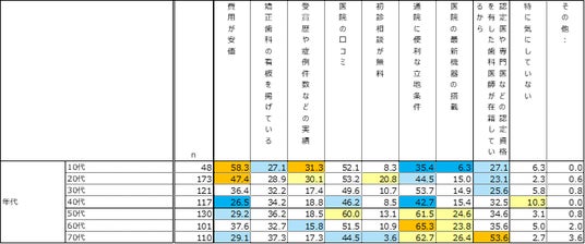 - 矯正歯科医院を選ぶ際の注目点として、全年代で「口コミ」および「通院に便利な立地条件」が高く挙がっている。