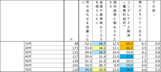 - 10代~20代ではコンプレックス解消(審美的目的)の割合が高く、10代は54.2%、20代は46.2%と半数前後を占めている。若年層は矯正を「治療」よりも外見を整える手段としてとらえる傾向にあるとうかがえる。また年齢があがるにつれ割合が低くなっている。
