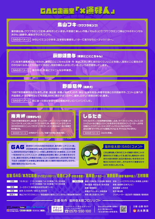 SJは鳥山フキ(ワワフラミンゴ)、福井は萩田頌豊与(東京にこにこちゃん)、安田ファニーは野田慈伸(桃尻犬)とそれぞれタッグを組み、各演出家がキャスティングした俳優の出演者とともに、この日だけのオリジナルコントを披露します。普段のGAGのコントとは異なる、この場でしか見られない極上のステージをご堪能ください。