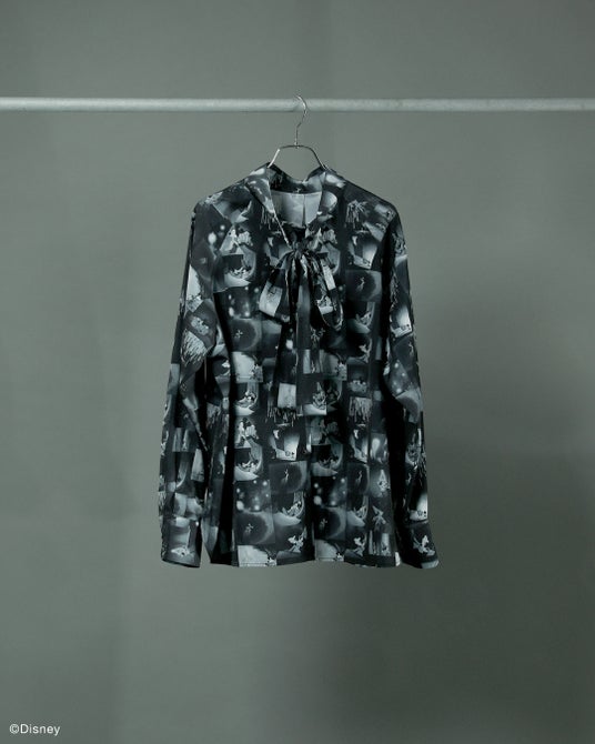 名場面を総柄に落とし込んだボウタイブラウスは、モノクロでシックな印象に仕上げました。ボウタイ部分にさりげなく入れたFANTASIAのロゴもポイントです。また、キラキラと輝くスパンコールビスチェにも、ボウタイブラウスと同じ総柄プリントをチュールに施しました。