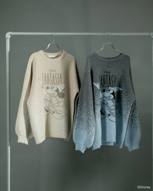 冬に欠かせないニットアイテムは、「ミッキーマウス」の魔法でだんだんと色が染まっていく様子をグラデーションで表現。ゆったりとしたサイズ感と、グレーとベージュのベーシックなカラー展開で、ユニセックスに楽しめるアイテムです。