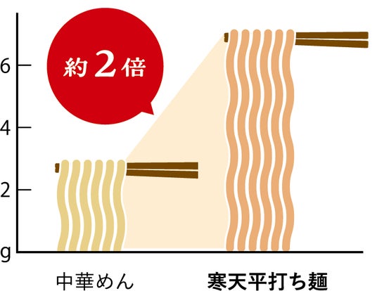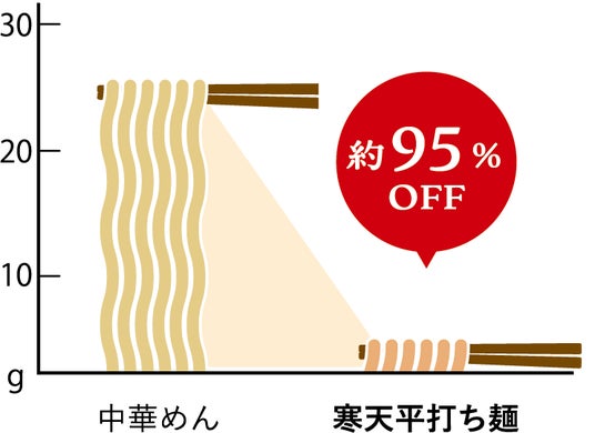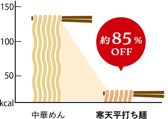 日本食品標準成分表(八訂)増補2023年版における「中華めん ゆで」と比較すると、湯戻し寒天麺(麺のみ)は糖質約95%カット、カロリー約85%カット。食物繊維を約2倍含んでいます。