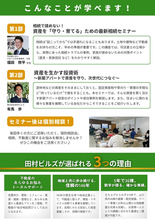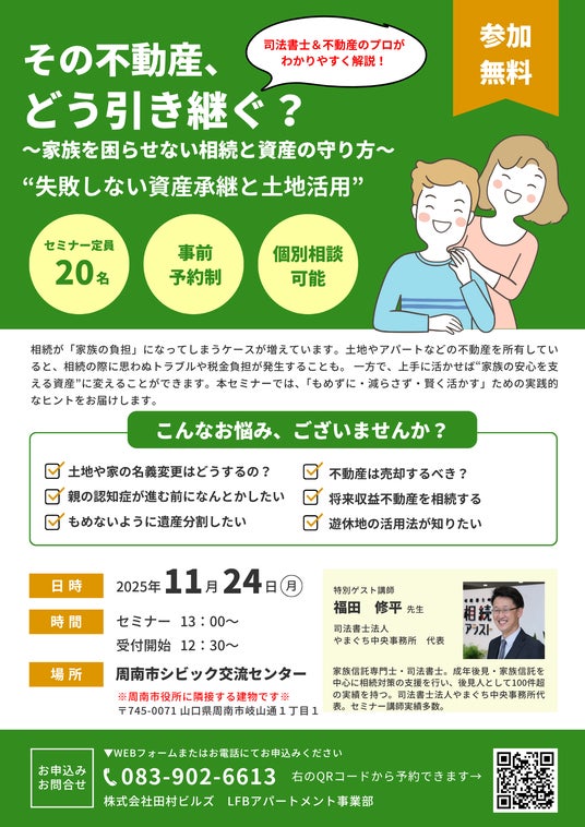 株式会社田村ビルズ(本社: 山口県山口市黒川 代表:河村英治)が提供するLFB APARTMENTのセミナーを開催いたします。本セミナーは将来を見据えたアパート経営をサポートさせていただくために、「将来のために資産形成をしたい」「アパートを相続する予定がある」「遊休地を活用したい」「売るか、保有し続けるのがいいか分からない」このようなお悩みを抱えている方におすすめです。