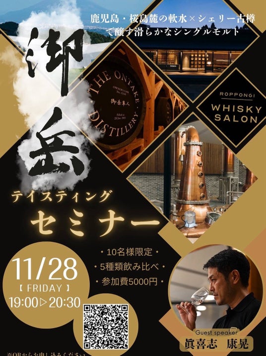 バー六本木ウイスキーサロンは、この度、本格焼酎「薩摩宝山」の西酒造が手掛けるクラフトウイスキー「御岳」の特別セミナーを開催いたします。豊富な天然軟水と長年培われた独自の酵母、厳選された二条大麦を使用し、さらにシェリー古樽を用いたこだわりの熟成によって深みのある味わいを生み出す「御岳」の魅力を、その誕生秘話と共に深く掘り下げます。
