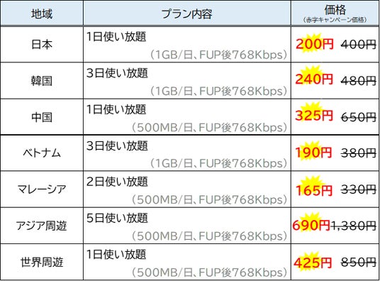 期間中は、すべての地域・すべてのプランが半額で「いつでも」「どこでも」「なんどでも」ご購入可能。購入済みデータは開通手続き前であれば1年間有効のため、事前購入も安心して行えます。特別な機会にお試しください♪(本キャンペーンは予告なく終了する可能性がございます)