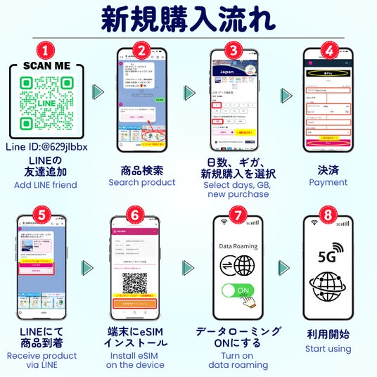 - 購入後、通信情報(eSIM&SIM)がLINE画面に自動送信され、手続きほぼ不要で即時開通。