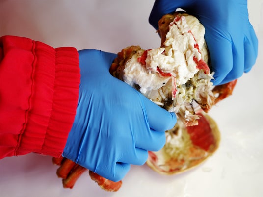 4. カニ足を左右の手で持ってバキッと真っ二つに。力はそれほど要りません。力を込め過ぎると飛び散る危険もありますので、優しく扱ってください。