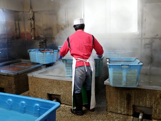 角上魚類 寺泊本店そばに構えられた加工場には、お風呂のように大きな茹で釜が3つ並び、カニを入れた大きなカゴごと茹でられるようになっており、茹でるのは浜ゆで工程を専門的に担当するスタッフです。