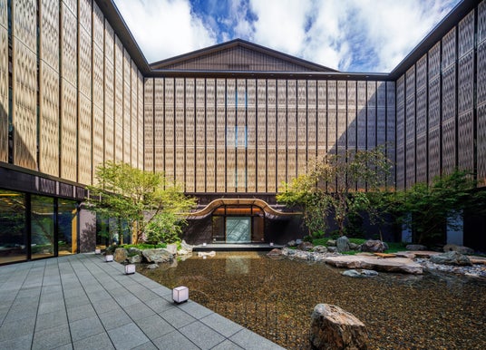 建物には、古来から、結界や厄や禍を払う“魔除け”の役割を果たすとされてきた「しめ縄」から発想を得たアートがエントランスに設置されているほか、ホテルと一体で開発した宮川町歌舞練場に見られる”唐破風屋根”の意匠を中庭に取り入れるなど、伝統的な要素を現代的に再構成しています。さらには、元新道小学校校舎で使用されていた建材も再利用し、過去と未来をつなぐ象徴的な建築を実現しています。
