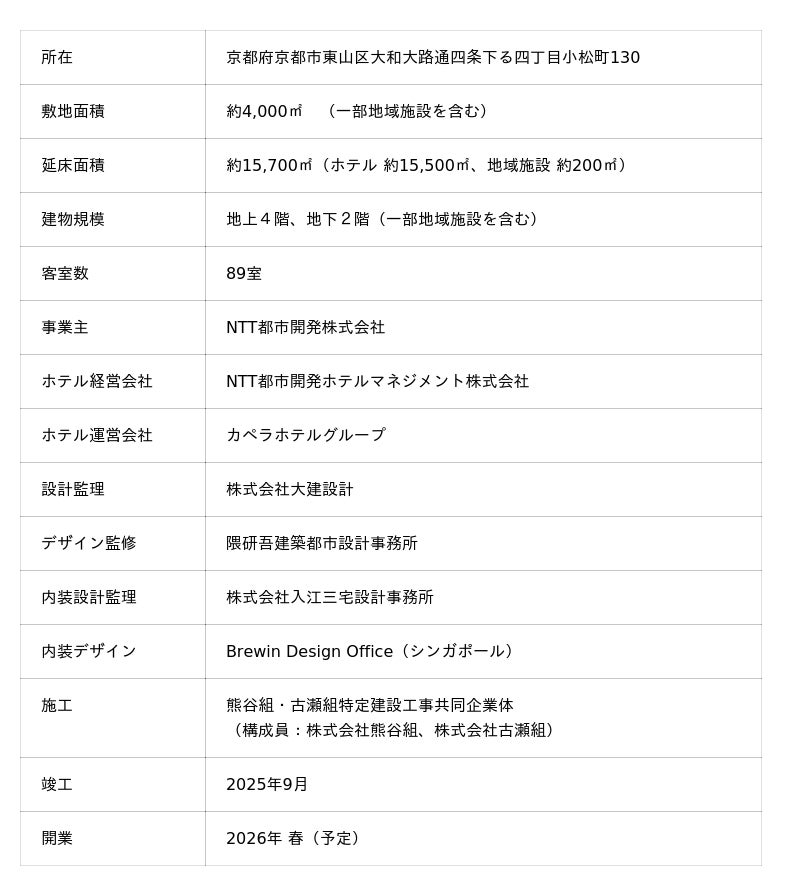 NTT都市開発株式会社(本社:東京都千代田区、代表取締役社長 池田 康)が開発・所有し、グル ープ企業でホテル経営会社である NTT都市開発ホテルマネジメント株式会社(本社︓東京都千代田区、代表取締役社長 松本 順一)が経営するホテル「カペラ京都」(京都市東山区、運営:カペラホテルグループ、総支配人 ジョン・ブランコ)は、本日より、2026年3月23日(月)以降の宿泊予約受付をホテル公式サイトにて開始しました。なお、開業は2026年春を予定しており、詳細は決まり次第お知らせします。