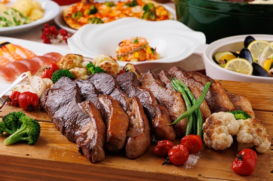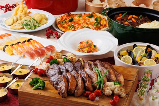 国産牛のビーフステーキ/天婦羅(海老・烏賊・さつま芋・蓮根・しし唐) /お寿司(鮪・サーモン・海老・烏賊・玉子) /牛の赤ワイン煮込み/豚肉と豆の煮込み/シーフードのレモン鍋/蟹グラタン/ピザ カプリチョーザ/蟹とりんご・セロリのサラダ/生春巻き/サーモンのタルタル/鮪のエスニック風/ロールケーキショコラ/プロフィットロール/アップルパイ/フランボワーズムース/花のベリーヌ など