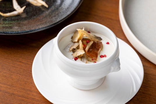 長野県産キクイモのヴィロードスープを浮かべたフォアグラのフラン