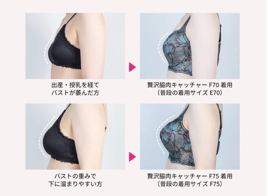 その中でも、軽いつけ心地でありながら、脇や背中のお肉をしっかり集めてきれいなバストラインを作り、理想のシルエットに近づく「贅沢脇肉キャッチャー(R)︎」。その特徴は以下の4点となります。