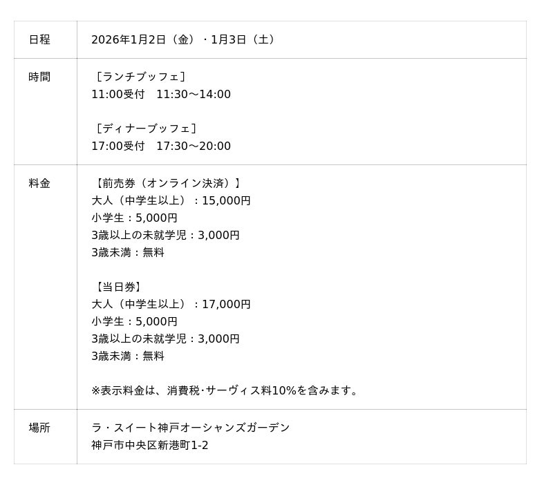 数量限定のおせち料理にマグロの解体ショー、お子さまも愉しめる縁日コーナーのほか、和と洋の2人の料理長による新年を祝うお食事をブッフェ形式でご用意。また、スペシャルゲストに「ものまね王座決定戦」優勝の経歴を持つ歌ものまね芸人デュオ「ダブルネーム」が登場し、多彩なものまねレパートリーを披露するほか、ものまねシンガーの「SHINOBU」も登場。さらに、当日は「ホテル ラ・スイート神戸ハーバーランド スイートルーム宿泊券」をはじめとした豪華景品が当たるお年玉大抽選会も。