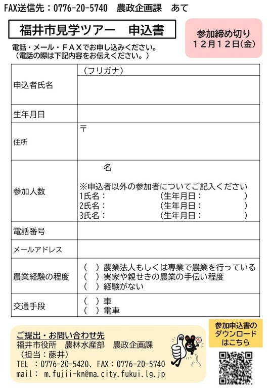 福井市農政企画課まで、メールまたはFAXにて申込書を送付してください。電話の場合は、申込書の内容をお伝えください。▶ 申込書のダウンロードはこちら↓