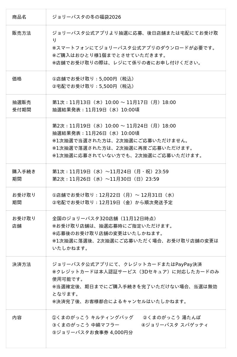 【ジョリーパスタ】「ジョリーパスタの冬の福袋2026」販売決定!「くまのがっこう」とのオリジナルコラボグッズや、4,000円分のお食事券を詰め込んだ福袋を5,000円(税込)で販売!
