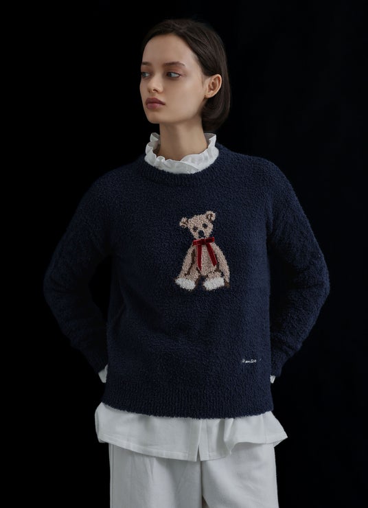 モールニットトップス赤いリボンをつけたテディベアが愛らしい、ニットトップス。一枚ではもちろん、薄手のトップスをインナーに重ねたスタイリングも映えます。