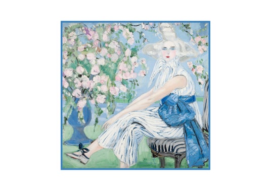 少し大判のサイズは、肌寒い日の首元にも活躍。ジャクリーヌ・マルヴァルが描いた人気女優ドリー・ディヴィスの華やかな図柄と、デザイン工房「マルティーヌ」の代表柄をあしらった2種類。
