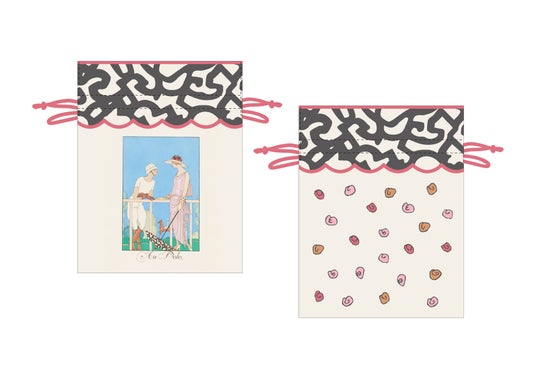 アール・デコ期の高級モード誌を飾ったジョルジュ・バルビエの洒落たイラストを、お茶目にアレンジ。クラシックとユーモアが共存する、大人可愛い巾着です。
