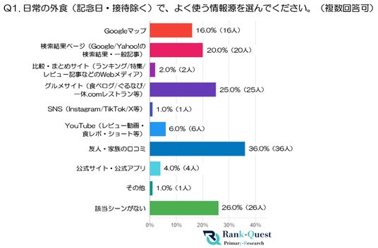 - 「グルメサイト」(25.0%)、「検索結果ページ(Google/Yahoo!)」(20.0%)と続き、オンライン上での情報収集も一定の割合を占めています。