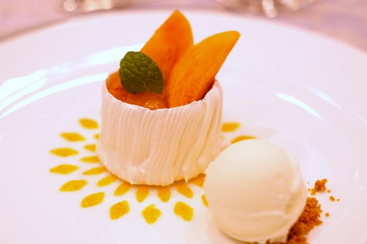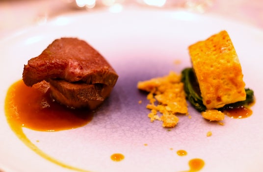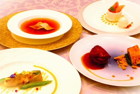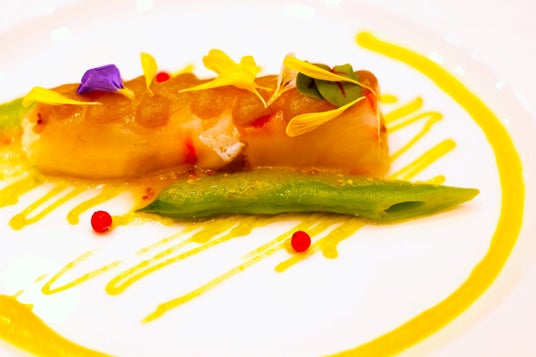 愛媛真鯛と秋茄子を包み込んだカネロニ仕立て 梨のソース・ヴィネグレット蜜柑のアクセント