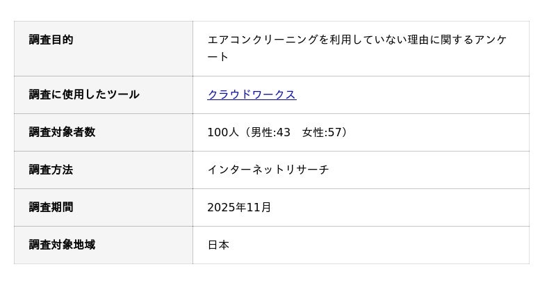 おうちにプロでは、エアコンクリーニングでお悩みの方により有益な情報を提供するために、「エアコンクリーニングの時間帯に関する独自調査」を実施しました。アンケート調査の概要は以下の通りです。