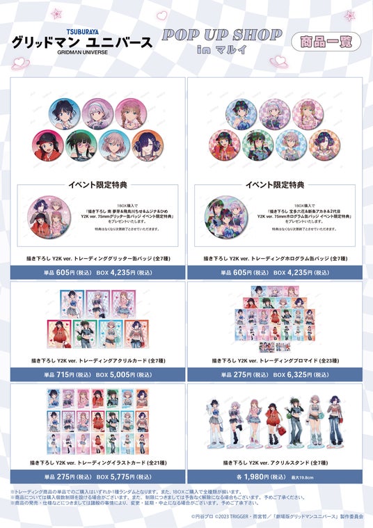 今回のイベントでは『グリッドマン ユニバース』より「Y2K」をコンセプトにした新規描き下ろしイラストを使用した新規グッズを多数先行販売する他、お買上げ抽選会などの実施を予定しております。