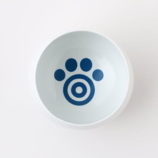 蛇の目のデザイン「見込み(底)部分には、青い二重丸が描かれた伝統的な「蛇の目」模様を採用しました。蛇の目は日本酒の色や透明度の違いがはっきりと映える模様とのことで、公式の「利き酒」などが必要な場面で古くから使われています。日本酒を視覚的にも評価してほしいとの思いから、この柄を採用しています。さらにただ楽しむだけでなく、「日本酒を飲む時間をもっとのんびりと楽しいものにしてほしい」という思いから、蛇の目模様を肉球にアレンジしました。
