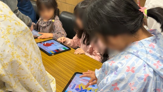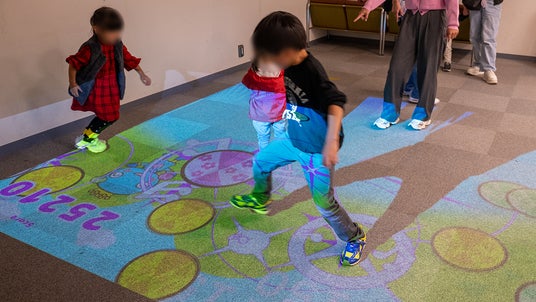 また、西宮市民会館内では、子どもコーナーの一角にデジタルブースを設置。(株)スピードオリジナルコンテンツ、タブレットでみやたんの塗り絵をすると3Dになって動き出す『お絵描きみやたん』や、足元に投影されたプレイエリアで、移動や足踏みをして楽しむゲーム『アシンキング』みやたんバージョンを実施。親子や友達同士などでの協力プレイも可能で、高得点を競い合った。
