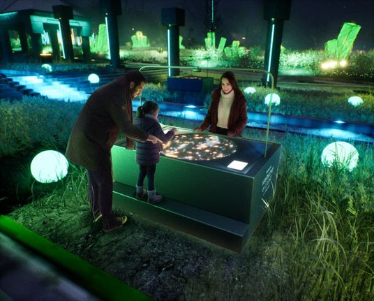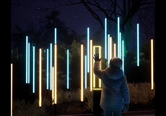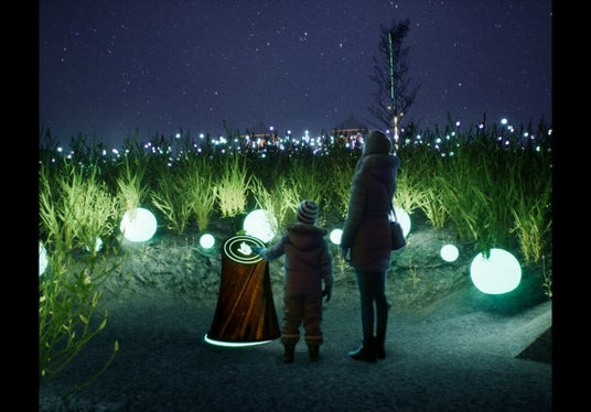 人と自然の共鳴: モニュメントに手をかざすと、灯りが音とともに周囲を輝かせる。