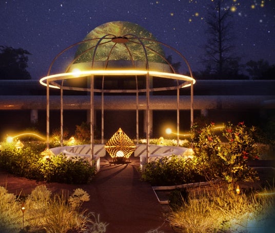 庭の中央には、生命の循環を象徴するHARMONY OF LIGHTのシンボルオブジェが設置されています。各所に配置されたモニュメントに手をかざすと、あなたの呼びかけに応えるように光と音が反応します。