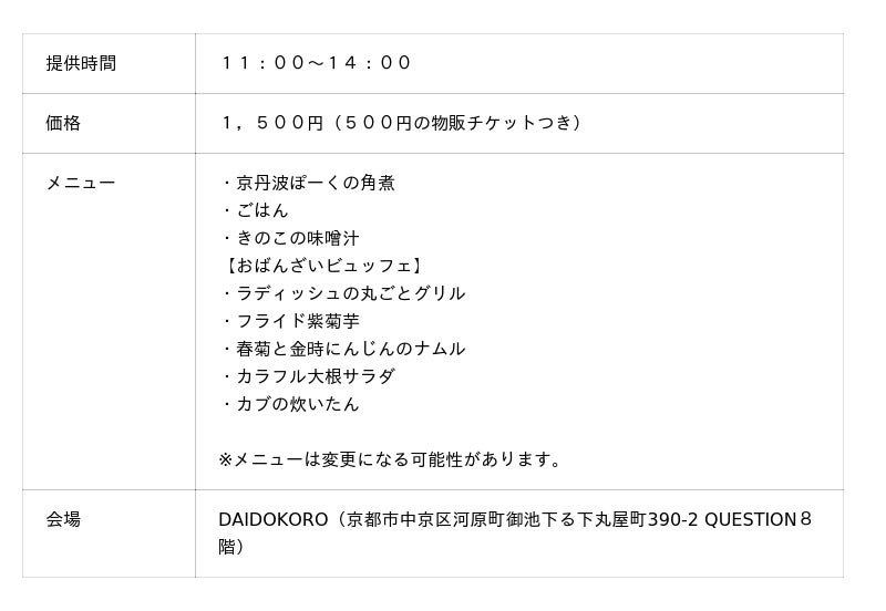 会場では、京丹波食材を使ったオリジナルランチの提供や、旬の野菜・地酒・加工品が並ぶ物産展を開催します。